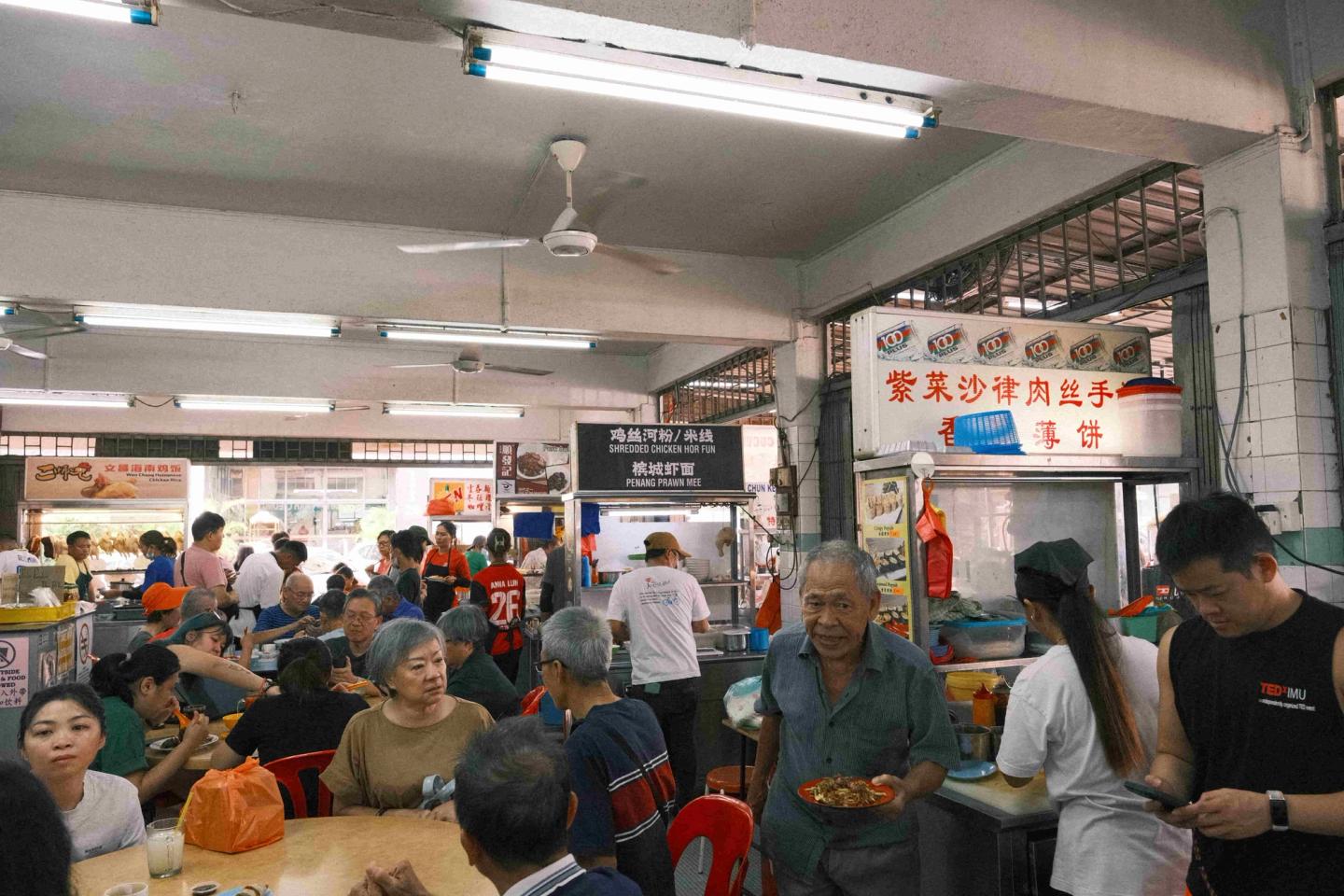 It was another kopitiam (coffee shop). Above me was a row of tubed lighting interspersed with spinning ceiling fans. Their combination cast shadows of the spinning fan on the people, food and table. Everything seemed a bit unreal, like we’d fallen into a time machine. If it weren’t for the men and women working quickly in tightly packed kitchens preparing bowls of noodles or chopped chilli, I’d have believed it was a dream.
