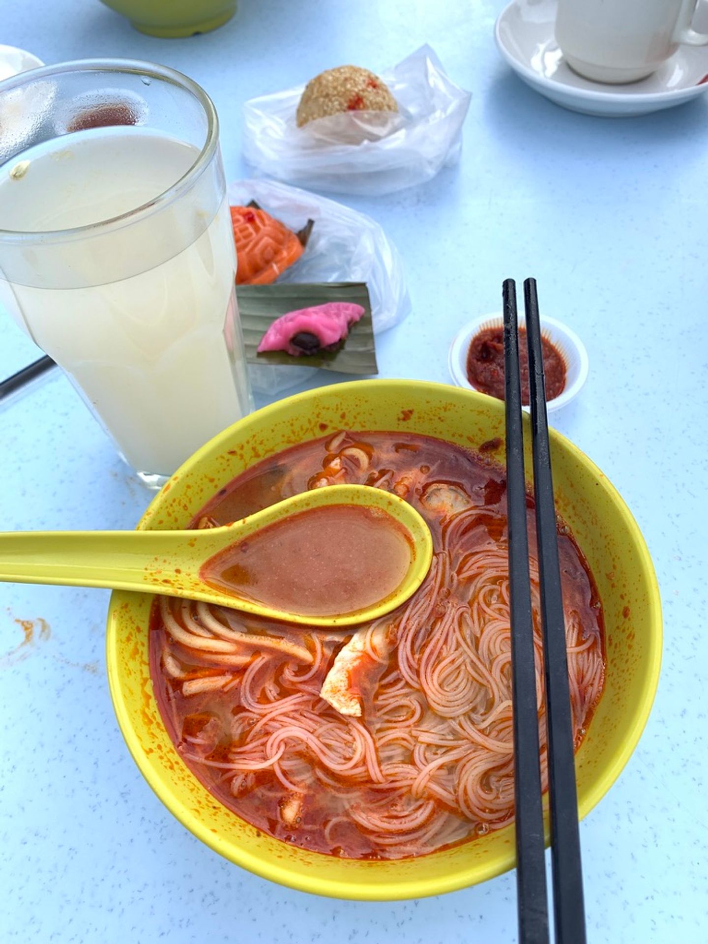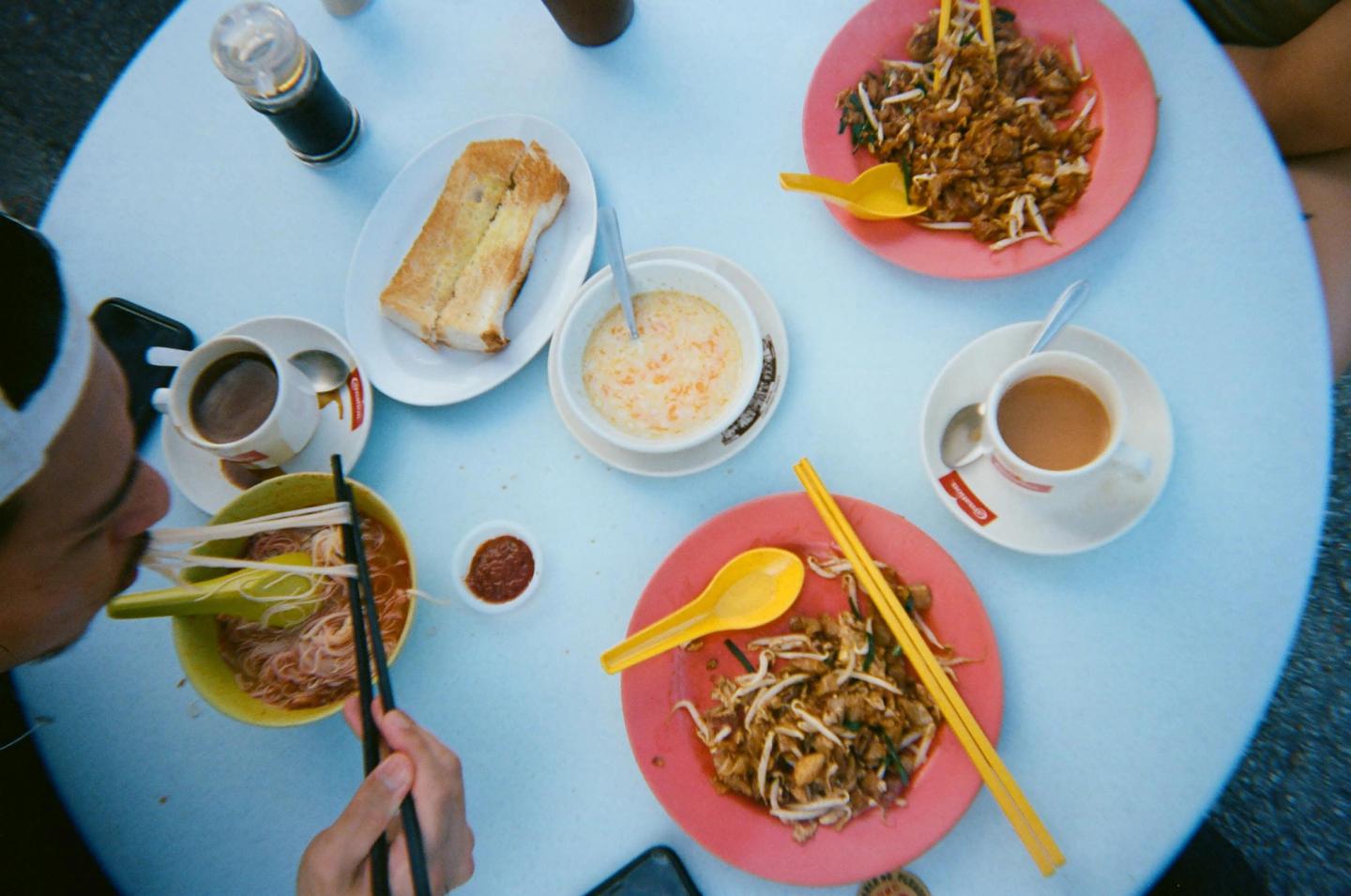 Everything around me was made from durable plastic. A round white table, red stackable stools, an olive green bowl and spoon, and black chopsticks. There was a cup of hot barley drink, as well as some Teh (milk tea), Kopi Kosong (black coffee), fried keuh teow (flat rice noodles) with clam meat, kaya toast, and soft-boiled eggs.