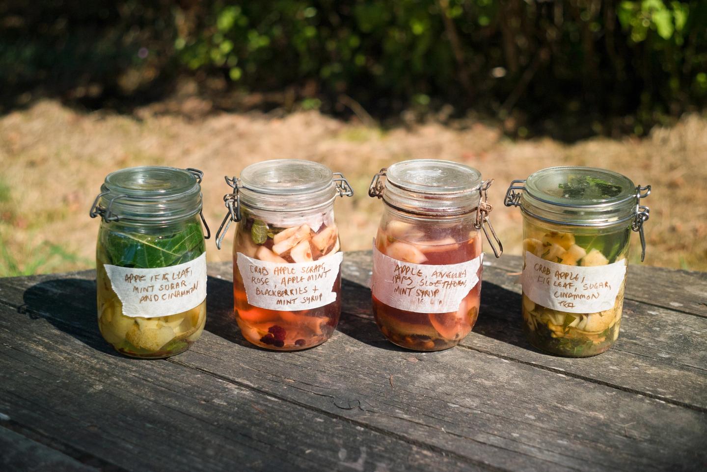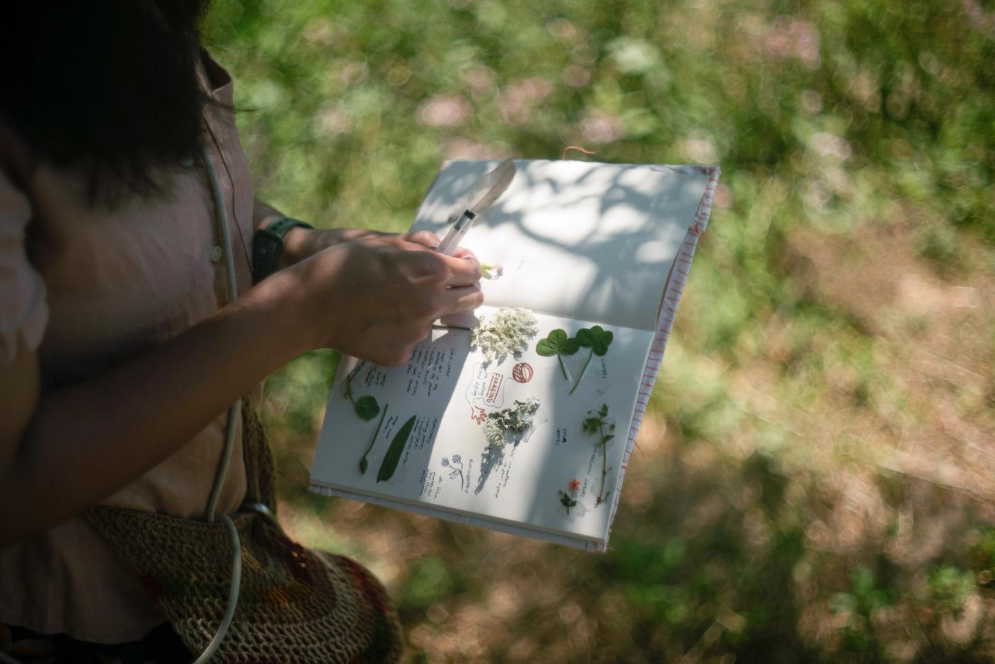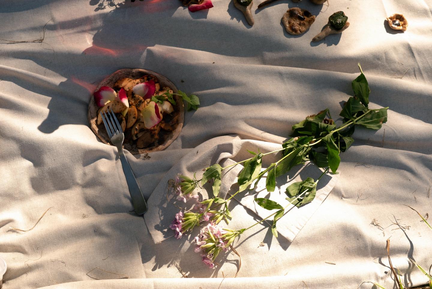 The workshop concluded with the tasting of several experiments on a picnic blanket. The menu included four types of landscape cold teas, grape leaf and vine infused milk (with a paring of soapwort foam), bread cutlery sculptures, Persian pebble bread, fig leaves butter, wild angelica polenta cake, ‘friendship pesto’ (nettle and plantago with pistachio), magical starlight salt, leaks cooked on open fire, a refreshing lavender hydrosol (or, as we called it, hydro-soil), dandelion honey and dandelion root coffee. Participants also displayed recipes, ideas, and foraging notes in notebooks, the cover of which was a portable textile tablecloth dyed with foraged plants.